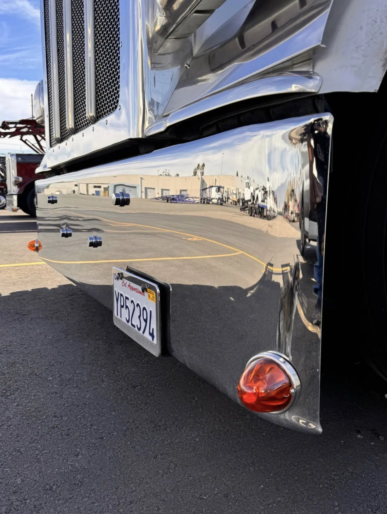 Brand new 19” Rolled End Texas Chrome Bumper for Peterbilt 389 — clean look and heavy-duty quality! Comes with 2 amber watermelon LEDs already installed to give your truck that classic show-truck style. ✨
